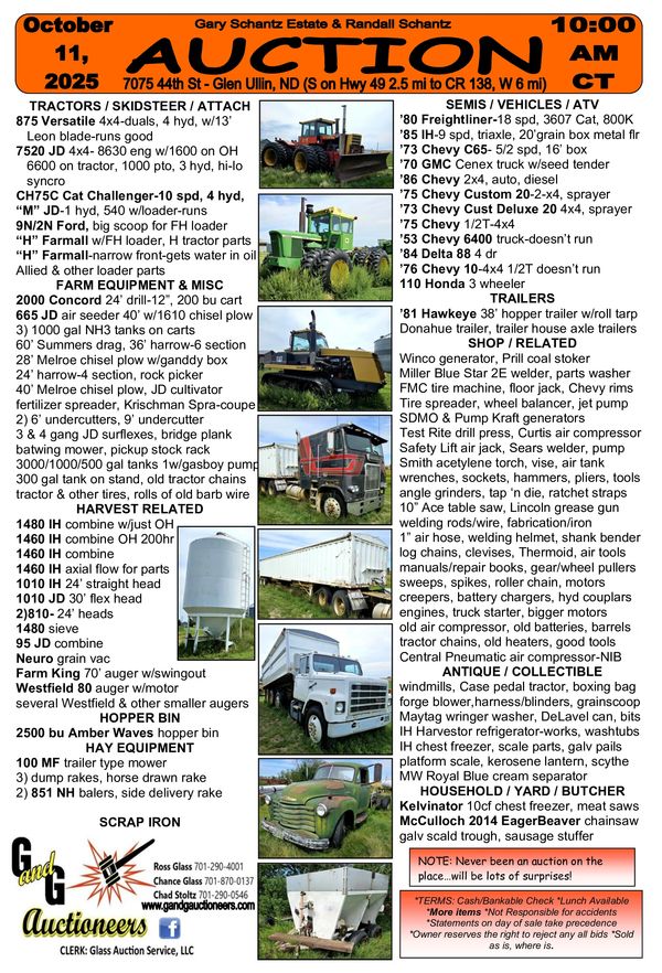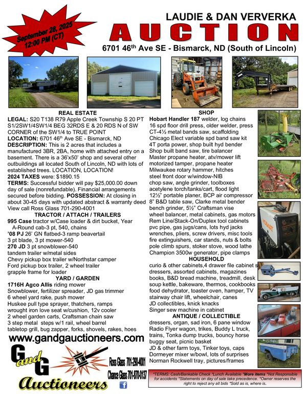 (From Bismarck Expressway & 9th St/Hwy 1804- South 9 miles, West-watch for signs day of auction)